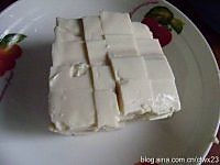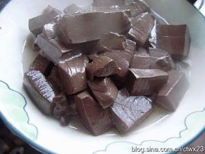 猪血撕去上面的薄膜,下面煎去四个角取出,用刀划成小块
