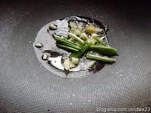 加入葱段、姜片、蒜末煸香,倒入适量酒