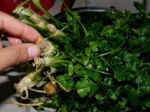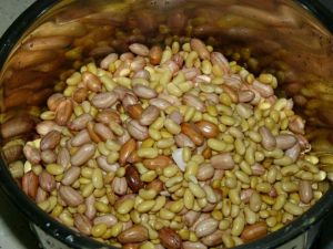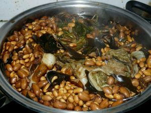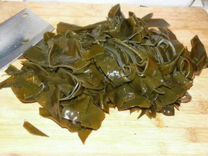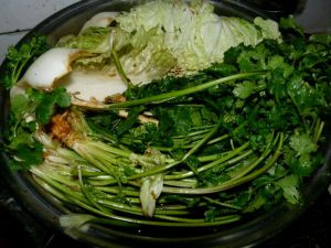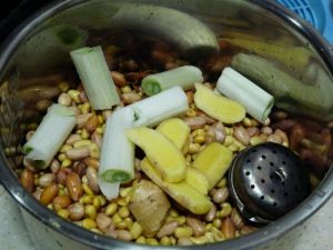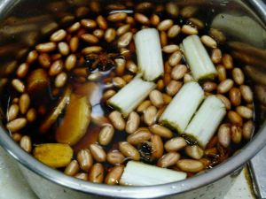 把焖好的花生黄豆到进锅里加入白菜香菜海带