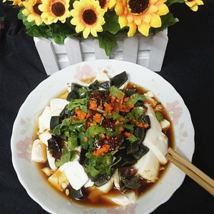 装入盘中,再撒上刚剁碎的香菜和胡萝卜碎,淋上香油、生抽、食盐、味精、白糖、郫县豆瓣酱等作料