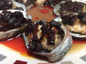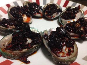 4、将洗净的鲍鱼壳放在盘子里,将打好花刀的鲍鱼放回鲍鱼壳里。将老干妈香辣酱放到鲍鱼上。