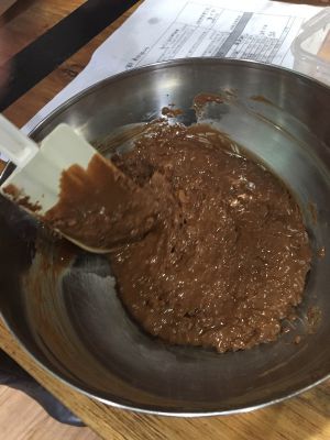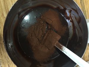 C中黑巧加入淡奶油中隔水加热,加入咖啡,筛入可可粉拌匀