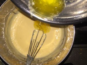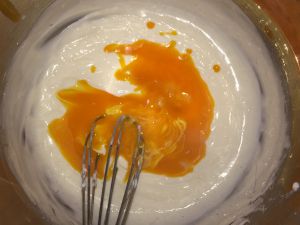 蛋黄分次加入奶酪糊中,边加边搅打均匀。