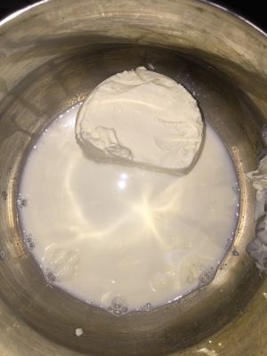 牛奶和奶酪倒入锅中,加热融化。