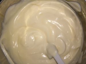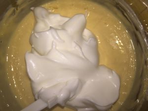 将打发的蛋白分次倒入奶酪糊中,由下往上翻搅,不要划圈,搅拌均匀。