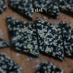 白糖放锅里熬的稍微变色,不需要加水!!加入熟芝麻迅速搅拌,栈板上放保鲜膜或保鲜带,擀平,趁热切开,冷了切了会碎