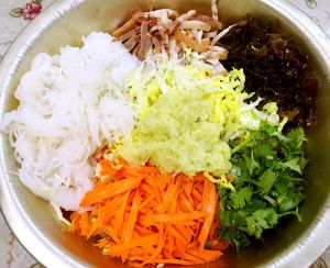 水发木耳用开水焯一下冷水过凉,切丝备用