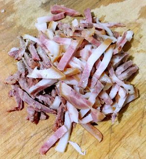 猪头肉用开水烫一下清除表面的油脂,切成丝