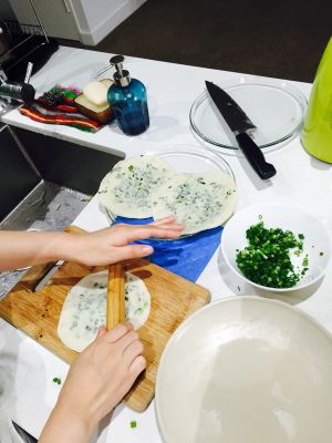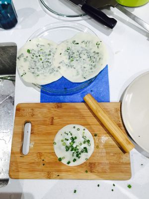 菜板上涂橄榄油,放饺子皮,饺子皮两面都要涂点油,撒上切好的小葱花