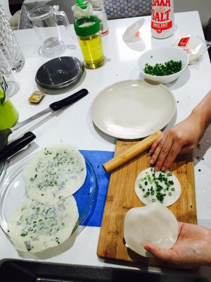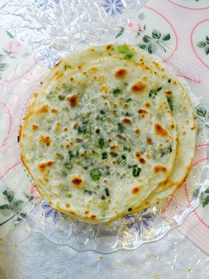 再放一层饺子皮,然后继续撒葱花,盐。总共5层,就可以出一张饼了