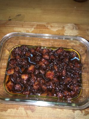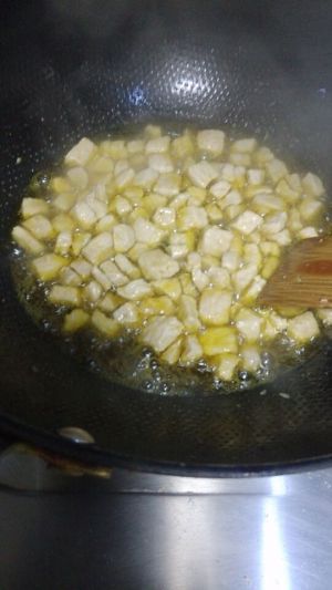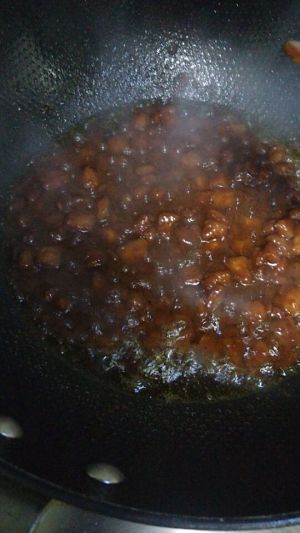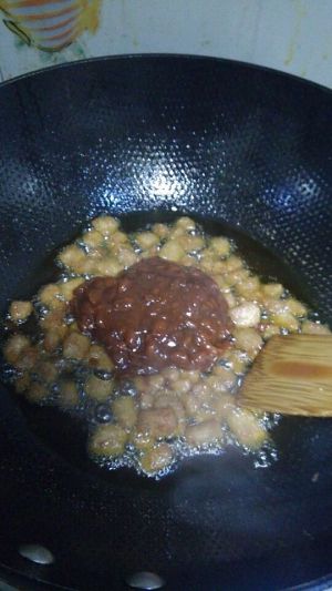 3.肉丁至金黄色,放入半瓶黄豆酱(接了个电话,炸的稍微老了,看着肉少了好多-_-#)