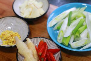 大葱用刀身轻拍后,斜切大段备用。大蒜和生姜切末。泡椒切小段,泡姜切细丝