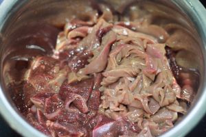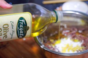 倒入橄榄油,然后全部拌匀后放置5--10分钟腌制。(这一步让猪肝在炒的时候不容易变老,而且锁住猪肝的肉质水分)