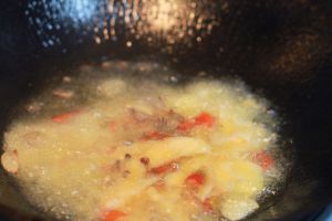 油七成热时,大火放入泡椒,泡姜,花椒和蒜片,翻炒