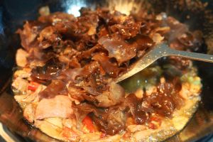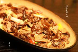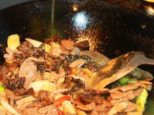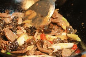 爆出香味后,倒入猪肝和腰子爆炒,倒少许料酒和生抽(料酒不光是去腥,也是为了让肉肉变嫩一点)
