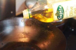 锅热后继续倒入橄榄油(这一步最好用菜籽油,川菜灵魂之一吶),要倒多点,平时炒菜3倍的油。(猪肝油少了炒不嫩的)