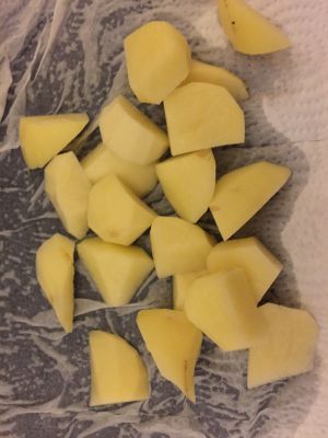 土豆去皮切小块,厨房用纸吸干水分,放入高温的油锅中炸到金黄