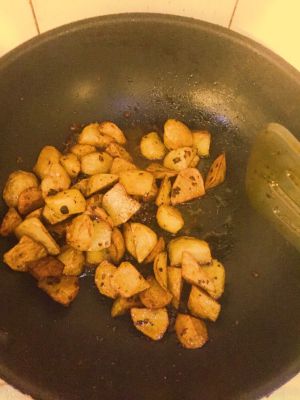 锅中倒油,放入老干妈和酱油炒香,倒入炸好的土豆块。