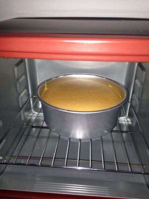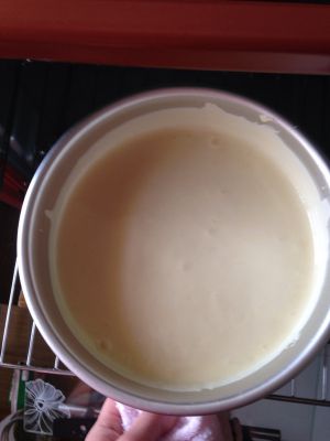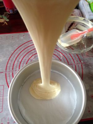 将翻拌均匀的面糊从高处倒入模具中,然后端起模具在桌上震几下,把大的汽泡震出来
