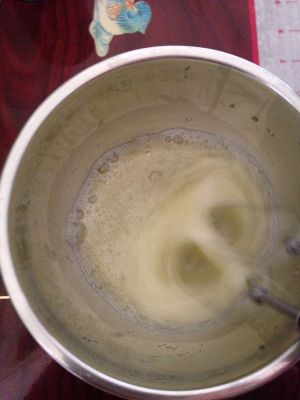 将蛋白打发至鱼眼泡状时加入三分之一的砂糖,继续打发