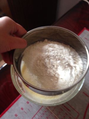 将低筋面粉过筛后加入到蛋黄糊中搅拌均匀,静置待用