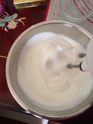 加入剩下的2次砂糖,蛋白打发至直立的尖角就可以了,这时候烤箱可以预热了