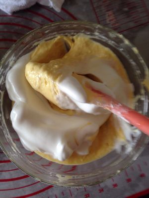 将三分之一的蛋白放入蛋黄糊中,用炒菜的手法翻拌,不能划圏搅拌,这样蛋白会消泡的,翻拌均匀的蛋黄糊倒入蛋白中,继续翻拌