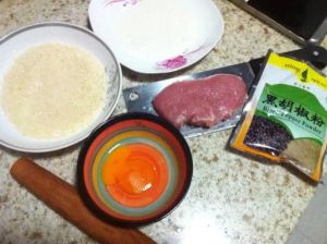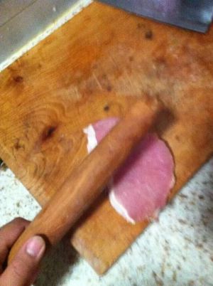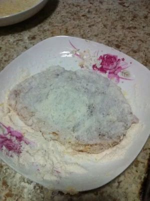 将猪肉敲打到面积扩大、厚度减少一半,撒上一撮盐和胡椒粉抓揉入味,放置15分钟。