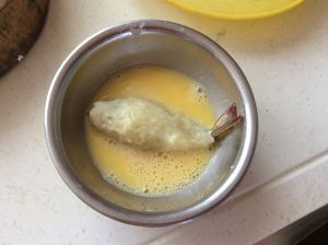 用土豆泥包裹虾仁,把虾尾留在外面,裹上蛋液备用。