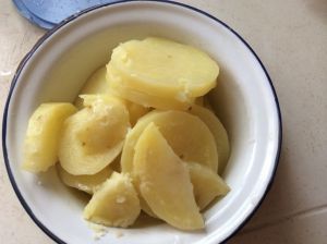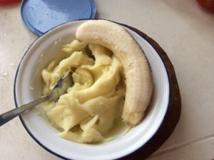 压碎的土豆泥加入一根香蕉(增加点水果香味),把香蕉也压碎,加少许盐调均备用。