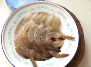 虾去头,去壳,去虾线,留尾巴,加少许盐,料酒备用。