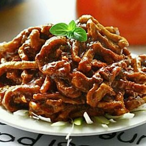 锅里放油,烧至五成热,放煨制好的肉丝快速滑炒!
