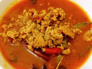 2,热油锅,下肉末爆炒,肉7分熟时入半碗水。水开后入干辣椒,花椒,肉桂,香叶和八角,中火烹煮5分钟后,入盐和鸡精,起锅完成。