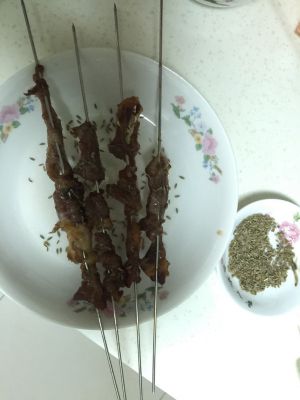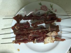 将羊肉穿成串,我一共串了10串,这是待烤的5串