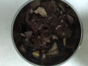 用洋葱,姜片,酱油和糖做成酱汁。将羊肉腌制20分钟。