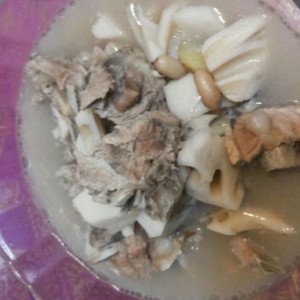 小火慢炖1小时,加盐、藕、花生。炖到花生、藕适合自己口感即可。
