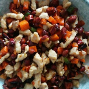 鸡胸肉切丁。水淀粉加入鸡精,料酒一半腌制鸡肉,一半备用。