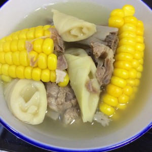 把排骨拣到炖锅里 有个窍门 开着火拿筷子一块一块的拣出来 这样就不会沾到血沫子 然后把笋和玉米还有切好的葱姜放入锅中
