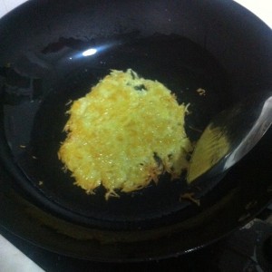 先将土豆用擦板擦成细丝,不可用水洗擦好的土豆丝,土豆里含有淀粉