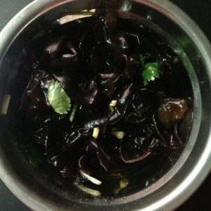 先搓洗黑木耳,撕成小片,厚的撕开,蒂除去。用水泡几十分钟减少味道,里面加点白醋。