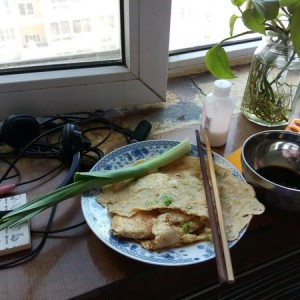 热平底锅,放油热,油在锅底流动均匀,倒进面糊,将面糊流动均匀,待饼边上变色,翻过面饼,饼变焦黄,就可以出锅了