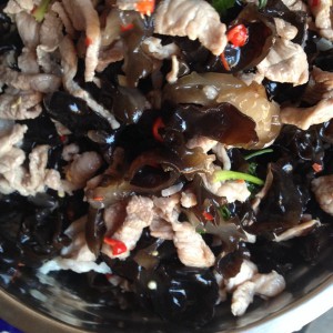 把肉和黑木耳放在小盆里把柠檬挤上,切碎的香菜和小米辣放在小盆里放盐、味精搅拌即可