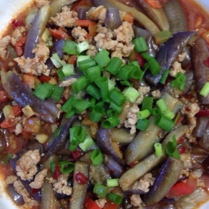 下茄子炒均匀放入调好的汁,翻炒,就可以出锅了,