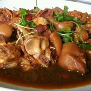 把煮好的猪手倒入炒锅,加盐,酱油,剁椒继续煮。