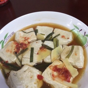 将臭豆腐用清水冲洗后装盘,放入葱,姜,蒜蓉辣椒酱,再淋上料酒,生抽酱油和麻油