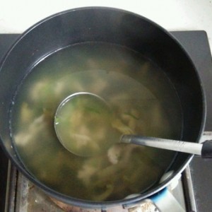 水烧开,先把榨菜放进去煮一下,这样榨菜的咸味才能煮出来。再放瘦肉,放完,也煮一会,确保瘦肉熟了。最后放芹菜末,加点鸡精就好了。