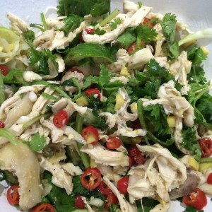 【辅料】大蒜,姜,小米辣都切碎(越碎越好)放在一个小碗内,香菜洗干净切小,铺在撕好的鸡肉上面,撒上盐,柠檬切开把汁挤进去拌一下,锅内放少量油,待油七成热放入蒜,姜,小米辣,花椒爆香,倒入鸡肉中拌匀即可