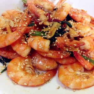 取出虾后国内留有少许热油,依次放下细葱、蒜瓣,生姜爆香。放入辣椒、花椒、翻炒几次加入小半碗水,加糖加盐。