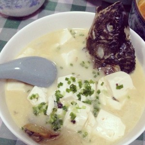 放入用凉水浸泡过的豆腐(切块),继续大火烧开后转小火慢炖8-10分钟,最后放入盐。撒上葱花,鲫鱼豆腐汤就完成了!