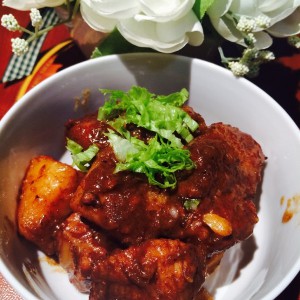 30分钟之后汁收至一半,下入土豆块,放盐,鸡精翻匀,尽量使土豆全都没入汤汁中,继续加盖炖10分钟